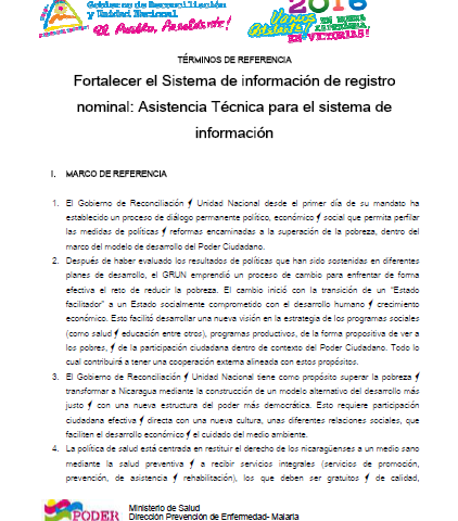 malaria y su implantación en los distintos niveles en la Red de Servicios de Salud, que permita a las autoridades de cada nivel de atención, contar con una herramientas automatizadas que genere información en los distintos sistemas de trabajo; obtenida por los equipos de salud familiar que incluye a los técnicos de Enfermedad de Transmisión Vectorial (ETV) y la red de Colaboradores Voluntarios Comunitarios, dinamizando los procesos integrales en desarrollo, como base para la toma de decisiones.